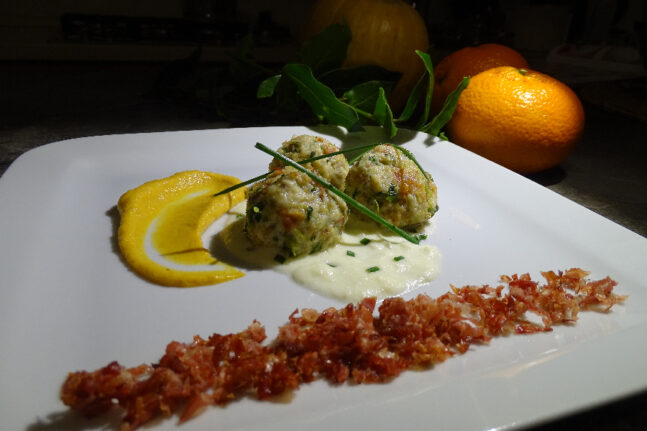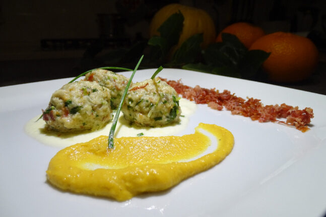 Comporre il piatto con la base composta di fonduta di morlacco, adagiare i canederli aggiungere la crema di zucca e lo speck croccante