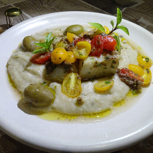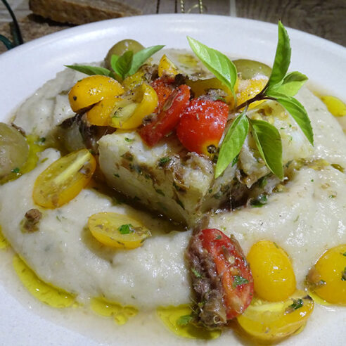 Merluzzo Nordico a bassa temperatura con crema di patate al pesto di aglio orsino