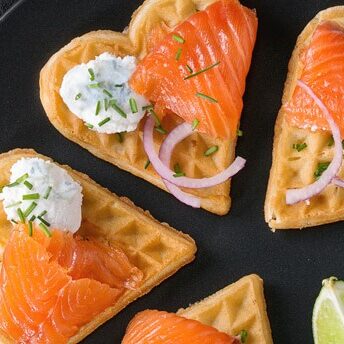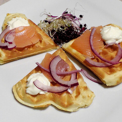panna + sale  - Comporre i waffel con salmone, crema di Gorgonzola, erba cipollina e/o Cipolla di Tropea tagliata sottile